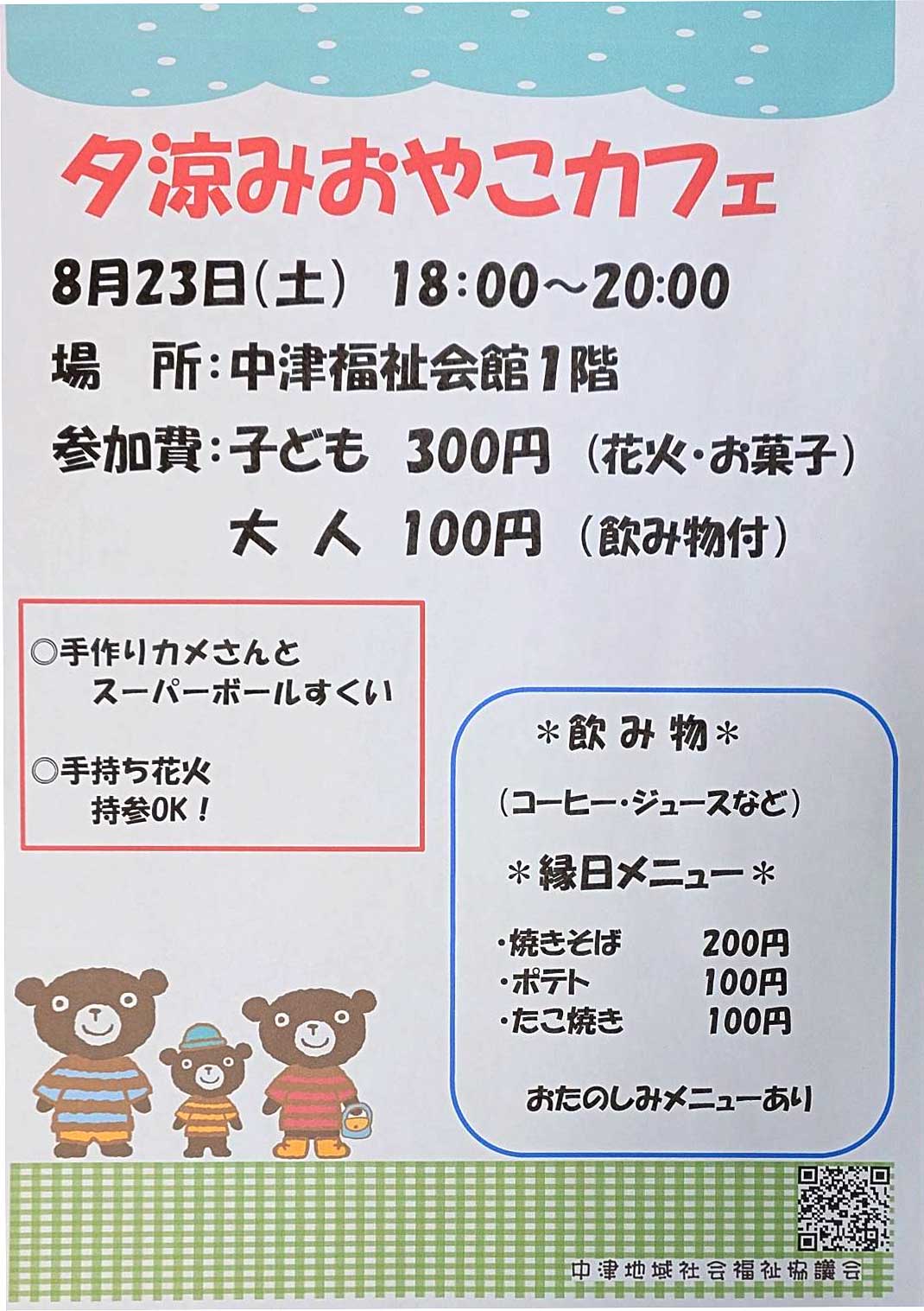 大人の方は参加費100円。飲み物付き。メニューは下段でご紹介。