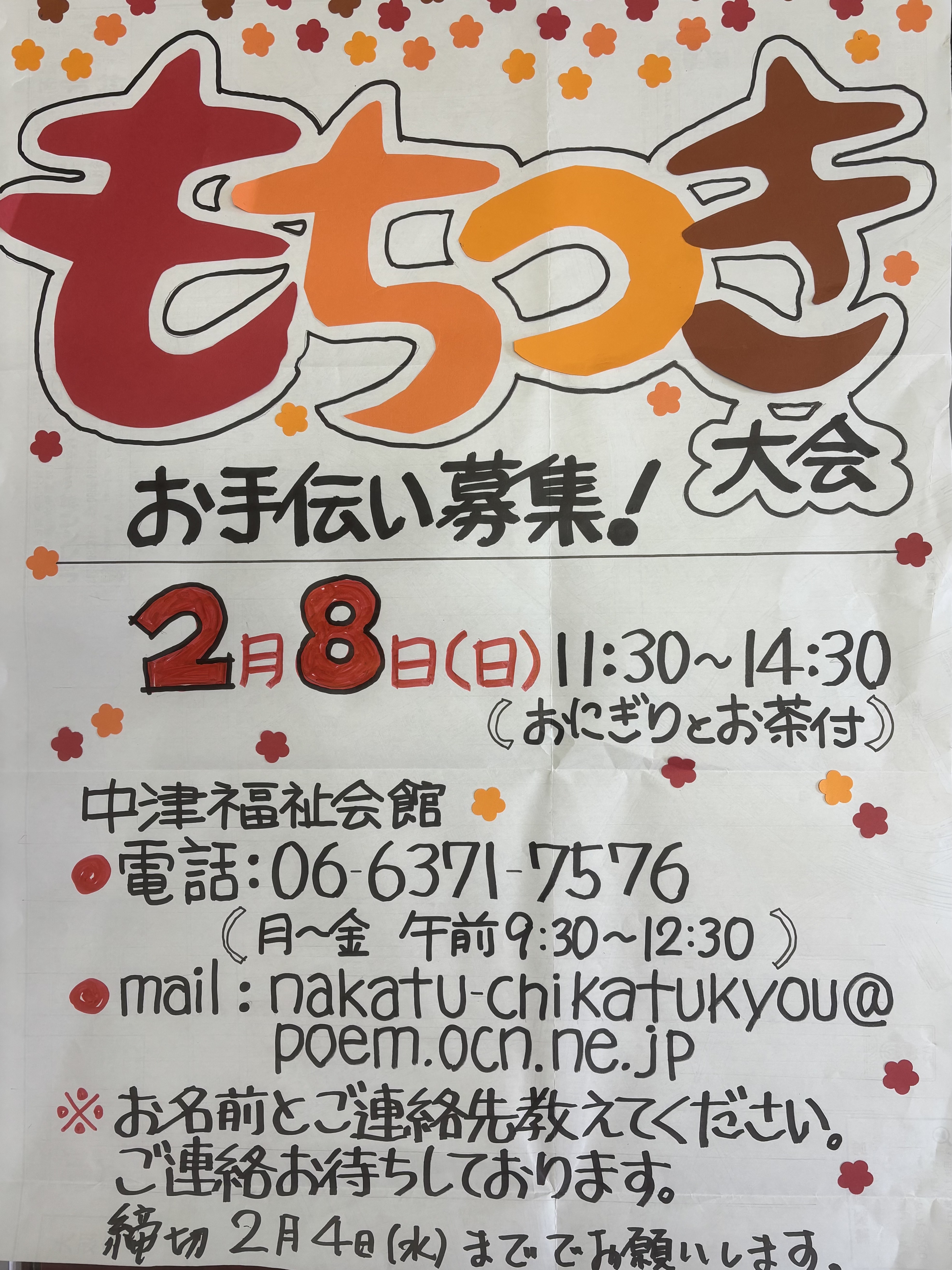 お手伝いしてくださる方も大募集! もちつきを楽しみたい方! ぜひお手伝いお願いします!! 搗き手だけでなく、丸めたり、あんこをつけたりのお餅仕事や 参加者へのお餅渡しなど、様々なお手伝いがあります。