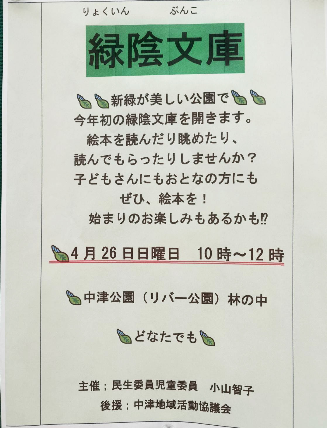 中津公園の木立ちの中で、ゆっくり絵本を読みませんか?